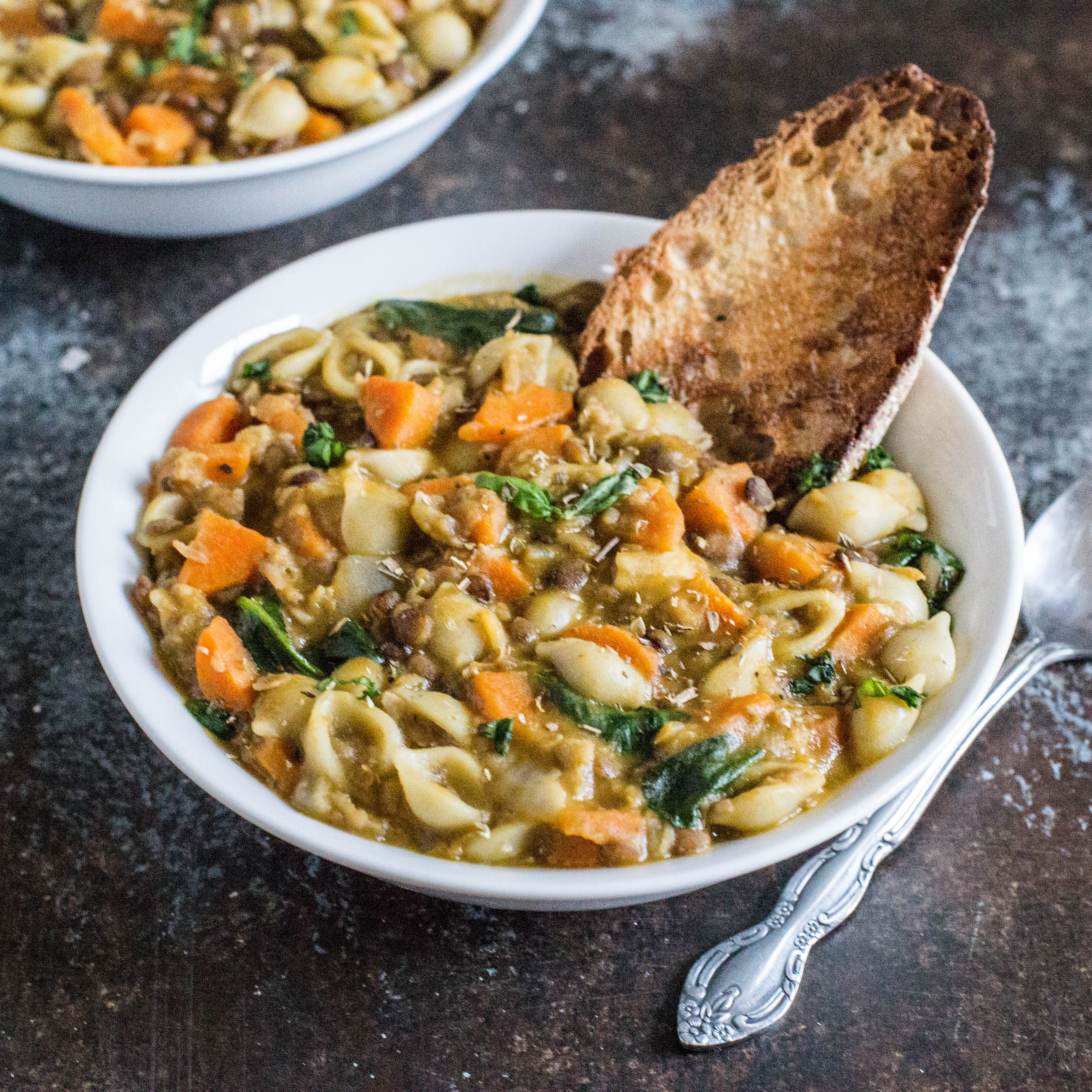 - Once the lentils and pasta are fully cooked and tender, stir in the spinach and season with salt. Allow to simmer for 2 more minutes to wilt, then remove from heat and serve.