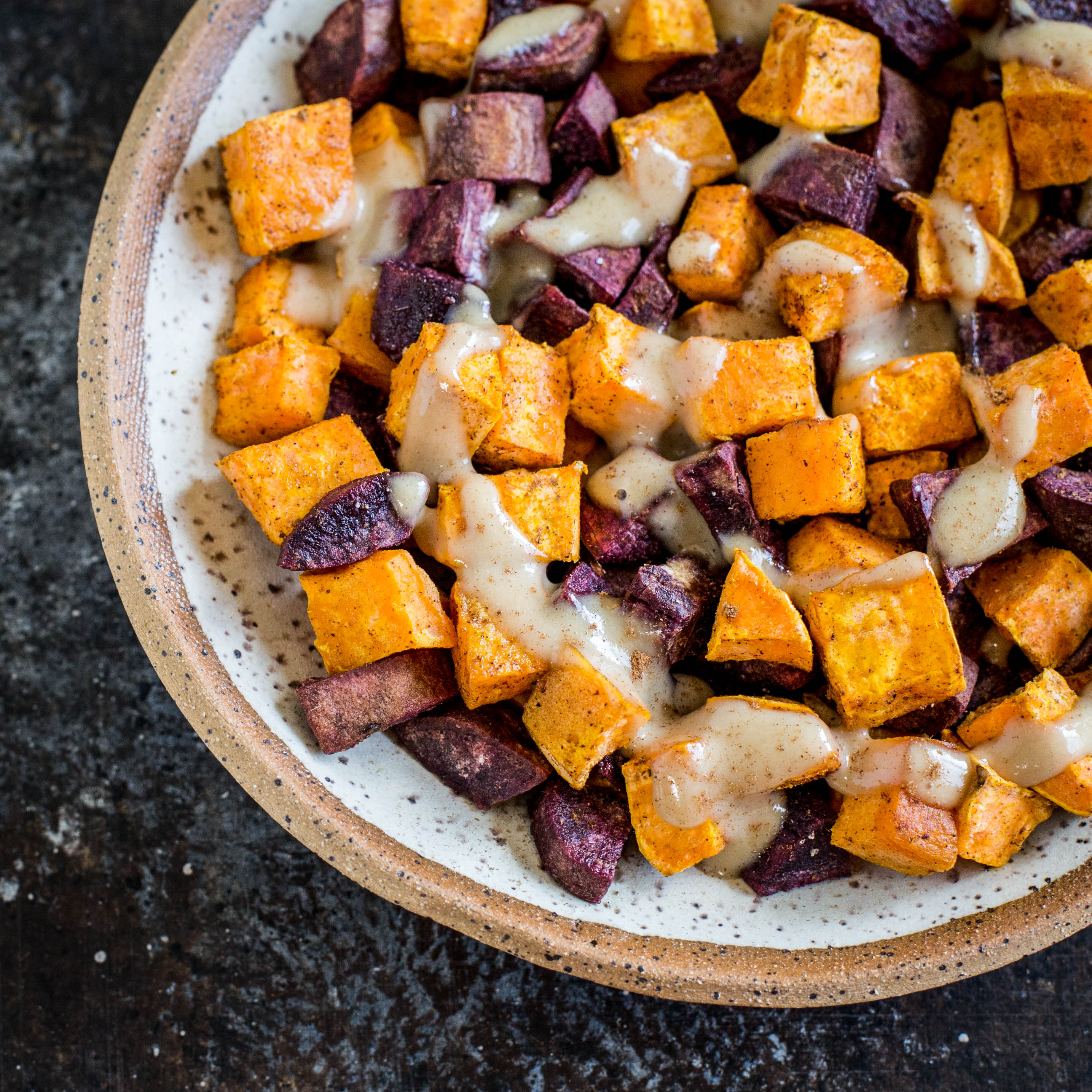 - Meanwhile, make the maple-tahini sauce, by whisking all of the sauce ingredients together until smooth. Drizzle over the sweet potatoes to serve.